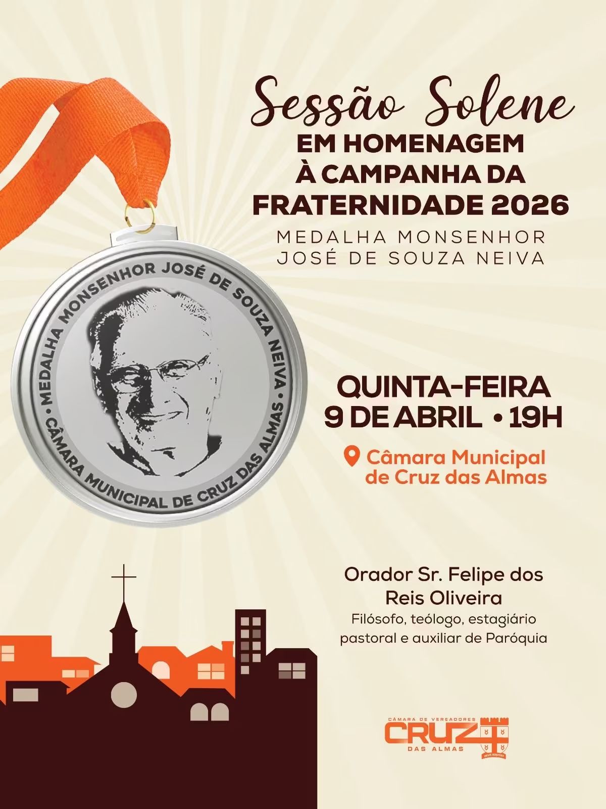 O Legislativo de Cruz das Almas se prepara para exaltar os valores da solidariedade e da justiça social na próxima quinta-feira, 9 de abril. Isso porque a Câmara Municipal agendou uma Sessão Solene, às 19h, em homenagem à Campanha da Fraternidade 2026. Dessa maneira, o evento pretende reunir autoridades, convidados e toda a comunidade local na sede da Casa.
