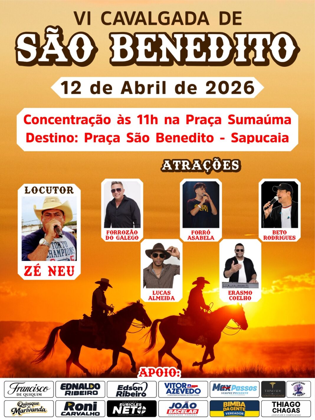 Hoje, dia 12 de abril de 2026, a cidade de Cruz das Almas celebra a força da cultura sertaneja. Isso acontece porque a comunidade da Sapucaia realiza a aguardada VI Cavalgada de São Benedito. Em primeiro lugar, é importante destacar que o evento une a paixão pela montaria à forte devoção religiosa dos moradores. Além disso, toda a renda da festividade será revertida para a festa do santo padroeiro.